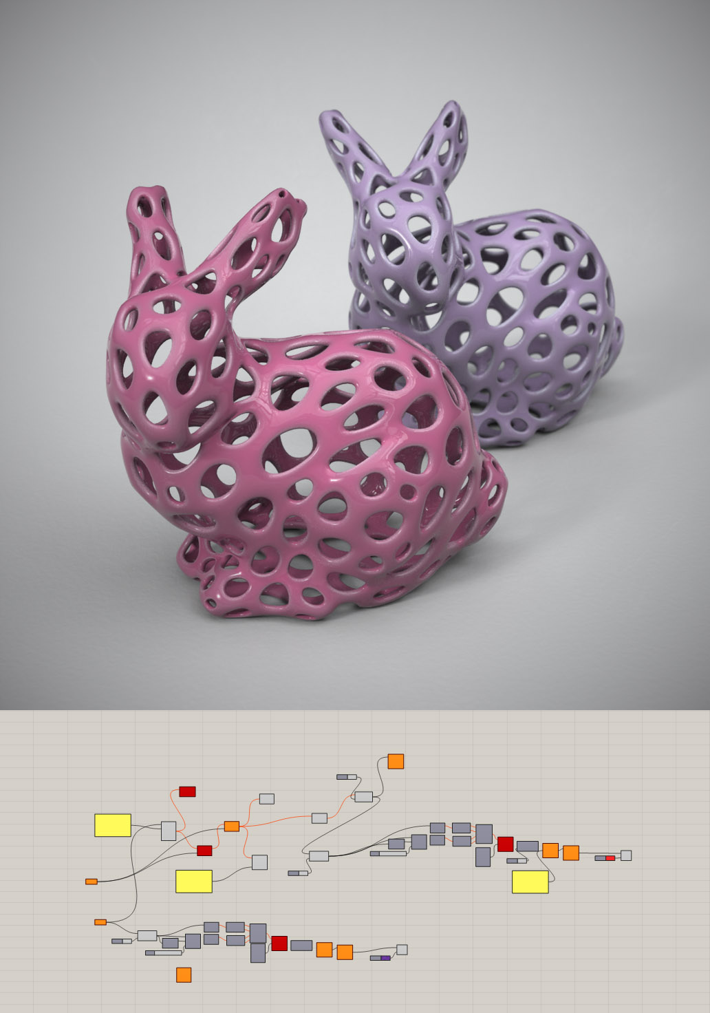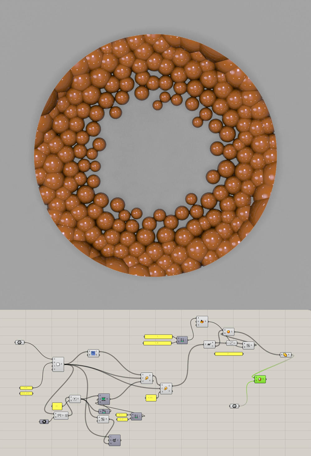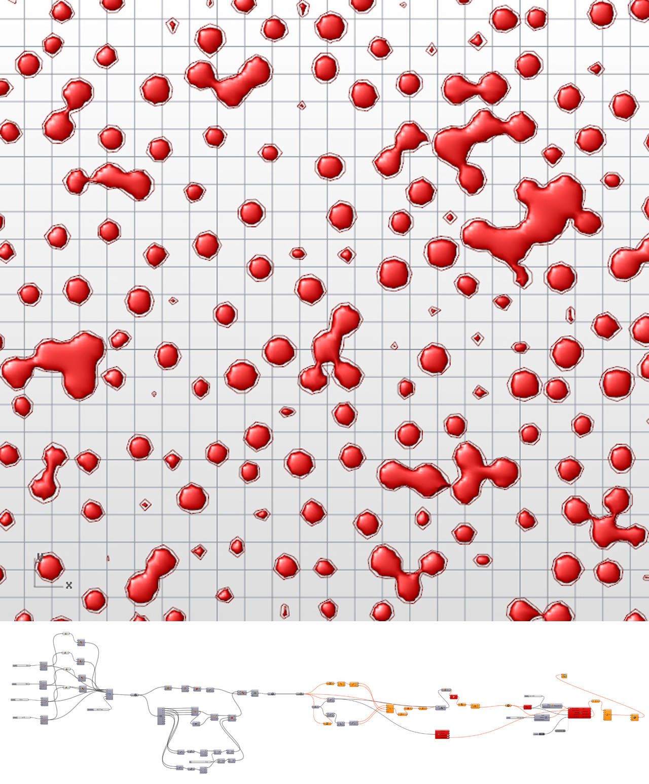 Made some drops using 2d metaballs, converting these to meshes and pressurizing them with kangaroo. Each mesh is double sided (like a pillow sleeve). So the goal is to first project the double sided mesh to a surface and then to inflate the topside. In the image above it worked on a flat surface. Problem with complex surfaces is that the mesh needs to be very denseto be projected nicely and the script becomes too slow.